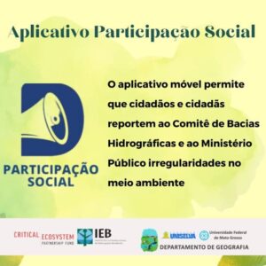 Como resultado do projeto com o CEPF Cerrado, o aplicativo de Participação Social foi desenvolvido para monitorar e coletar dados georreferenciados pelas populações locais. Elas podem colaborar com denúncias e informes, aos órgãos responsáveis, sobre problemas causados por desmatamento, erosão e assoreamento.