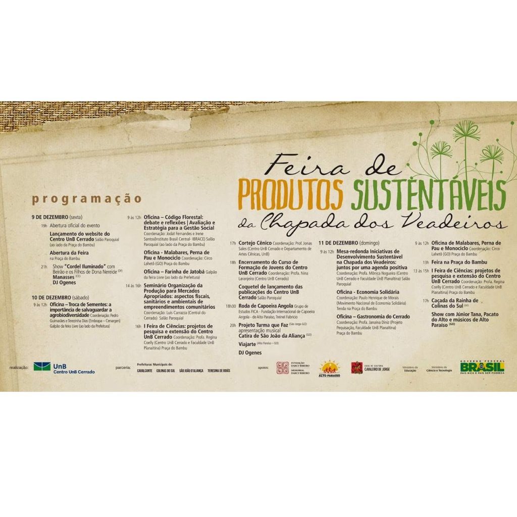 A primeira edição da Feira de Sementes e Mudas da Chapada dos Veadeiros foi parte da programação da I Feira de Produtos Sustentáveis da Chapada dos Veadeiros, com uma ampla programação de oficinas, seminários, gastronomia, feira de ciências, manifestações populares e a participação de mais de 20 expositores.