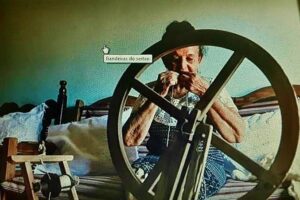 A fiandeira Maria de Jesus Coelho, 87 anos, sai de casa carregando a própria roda para se encontrar com suas colegas de trabalho. Elas costumam trabalhar juntas em pontos de encontro ora inusitados, como embaixo de uma árvore na beira da estrada.
