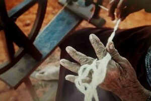 Para resgatar a tradição, elas tiveram que vencer a desconfiança dos maridos e o estigma da profissão, tida como atrasada. Na região mineira imortalizada por Guimarães Rosa como Grande Sertão Veredas, senhoras artesãs retomam o ofício, passado de mãe para filha, da produção têxtil artesanal (…). É tempo de estiagem no Cerrado Central. A poeira suspensa tinge de vermelho as árvores tortas. Não chove há mais de 90 dias e a baixa umidade de setembro faz o corpo carecer de água. Do interior da mata seca, sob um sol abrasador, uma a uma as mulheres chegam, trazendo suas rodas de fiar. Elas saem das roças, no assentamento Saco do Rio Preto, com destino à BR-251, estrada que liga as cidades de Natalândia a Bonfinópolis, em Minas Gerais. As vizinhas cruzam caminhos de terra batida. Cada mulher faz questão de carregar ela mesmo a sua roda. Cabelos grisalhos, Tia Maria anda encurvada, com o peso do instrumento de trabalho nos ombros. Antônia chega de carroça. Arlete de bicicleta. Na beira da estrada, debaixo da sombra de uma árvore, elas começam a fiar o algodão. “Não pode tocar na roda. Elas ficam enciumadas”, avisa Simone de Souza, integrante da Associação das Artesãs de Natalândia. Sentadas em círculo, as rodas se movimentam. Reque, reque, reque. É o som contínuo das batidas dos pés nos pedais e as rocas a chiar. A conversa é de comadres. Contam causos, soltam gargalhadas. Alegria além das palavras. Simone puxa a cantiga. “A roda que eu fio nela ô baiana, oi iá iá / É só eu que ponho a mão ô baiana, oi iá ia / Ou então minha cunhada ô baiana, oi iá ia”. Enquanto cantam juntas, movimentos delicados das mãos vão torcendo os capuchos de algodão, apertando o fio que se forma e que vai se enrolando no carretel. O gesto é repetido até a linha virar um novelo.