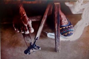 Dona Nega usa um par de cardas para desembaraçar as fibras dos capuchos de algodão. Esse é o primeiro passo da produção do fio usado pela tecelagem. As fiandeiras transformam o algodão em fios. Um ofício quase tão antigo quanto a própria humanidade. A roda e o tear manual são engenhocas trazidas ao Brasil pelos colonizadores portugueses. A primeira faz o fio. O outro, a trama do tecido. Com a mecanização e o desenvolvimento da indústria têxtil, o trabalho das fiandeiras e tecelãs praticamente desapareceu. Na região conhecida como Grande Sertão Veredas, no norte e noroeste de Minas Gerais, as fiandeiras, ou “fiaderas”, como preferem ser chamadas, mantêm viva a fiação manual. São guardiãs do passado, conhecem os mistérios de um saber feminino transmitido pelas avós, mães e tias. Uma tradição preservada pelo isolamento geográfico dos confins do sertão mineiro, território consagrado nas histórias do escritor Guimarães Rosa. Quando vemos a peça pronta para vender, desconhecemos o trabalho por trás dos fios. Após a colheita do algodão, primeiro retira-se as sementes e qualquer outro tipo de impureza. Pode ser feito à mão ou com um descaroçador, espécie de moenda feita de dois cilindros de madeira. Depois, carda-se o algodão, o que significa transformar os chumaços em uma leve pluma. Com pares de cardas (espécies de pás de madeira com pentes de aço), os capuchos de algodão são penteados de modo que as fibras fiquem desembaraçadas, prontas para a fiação. “O segredo é deixar torcer. Mas não pode torcer pouco ou demais. Você tem que saber o ponto que dá para soltar ou esticar a linha”, conta Maria Nilma, fiandeira de Riachinho (MG).