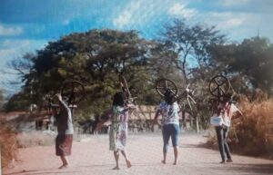 (Da esquerda para à direita, as fiandeiras Maria de Jesus Coelho, Antônia das Graças Braga Ramos, Arlete dos Reis Braga Ramos e Leosina Aparecida Silva Reis carregam suas rodas até o ponto de encontro onde trabalharão juntas. Nos fundos da casa, Dona Nadir guarda um bonito tear, usado para pequenos trabalhos. Ela é a única tecelã da região a praticar a técnica do repasso mineiro, com as linhas formando desenhos a cada passagem do fio.)