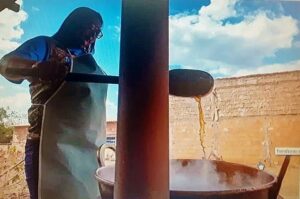 Maria Nadir Mendes, a Dona Nadir, é considerada a artesã mais experiente de Riachinho (MG). No seu sítio ela cultiva pomares, hortas e até um pé de algodão. “Eu não gosto de coisa química nenhuma. Coisa industrializada eu não dou certo com nada. Tudo que eu faço é artesanal”.