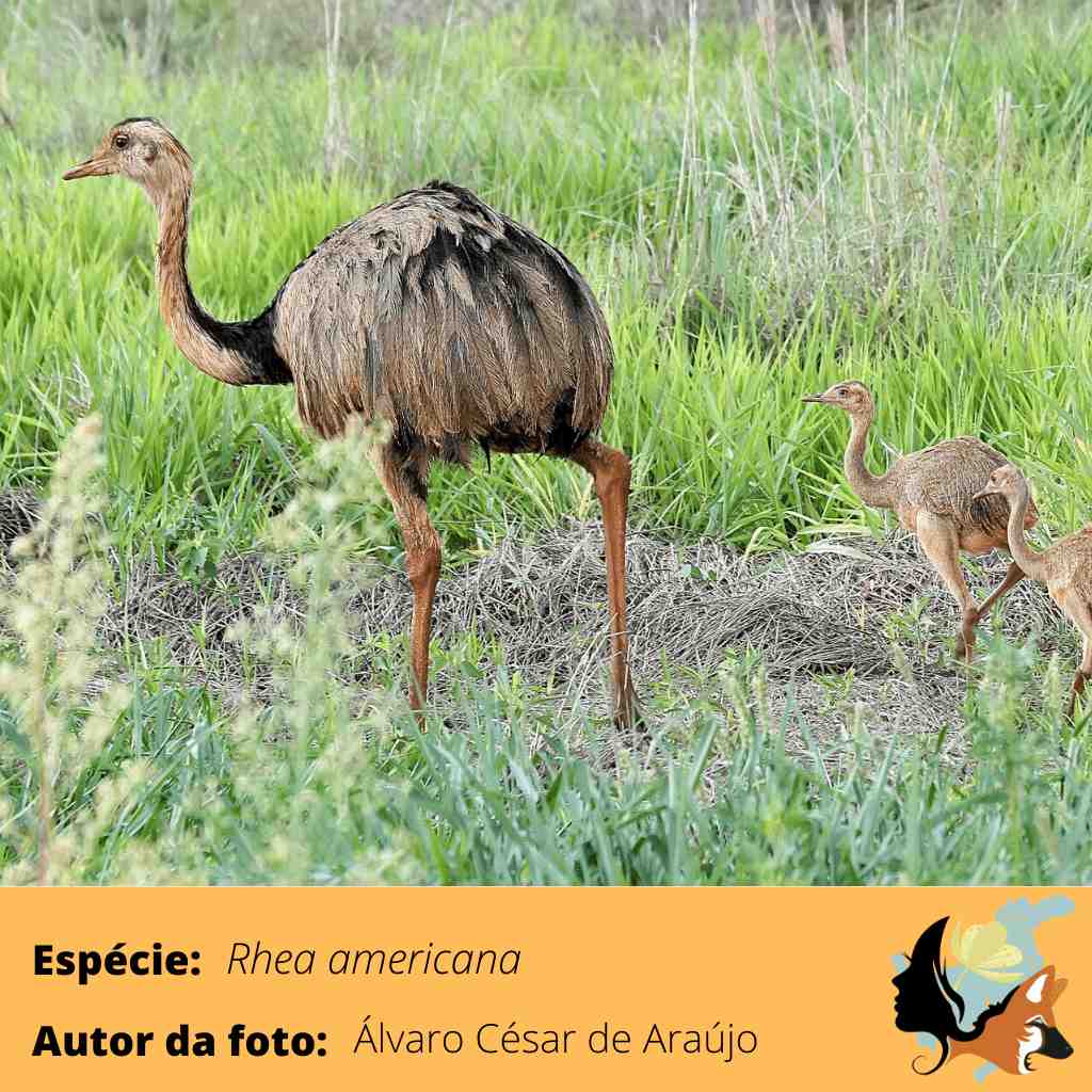 Rhea americana (Linnaeus, 1758) Vocalização Nome(s) popular(es) Ema. História Natural Habita formações campestres e savânicas, principalmente no Cerrado, Pampas e nos Chacos Bolivianos. Pode ser vista até em pastos e plantações. É incomum ou localmente comum. Onívora, se alimenta de uma grande variedade de itens: sementes, folhas, raízes, frutos, insetos (gafanhotos, besouros, etc.), moluscos, lagartos, roedores …