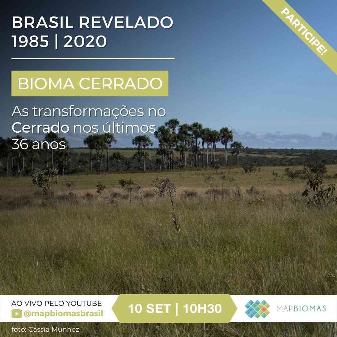 Webinar: Brasil Revelado 1985-2020 – As transformações no Cerrado MapBiomas Brasil Brasil Revelado 1985-2020: As transformações no Cerrado Webinar temático da Coleção 6 apresenta dados sobre o bioma e um debate focado no uso da terra na próxima sexta, dia 10 de setembro, às 10h30.