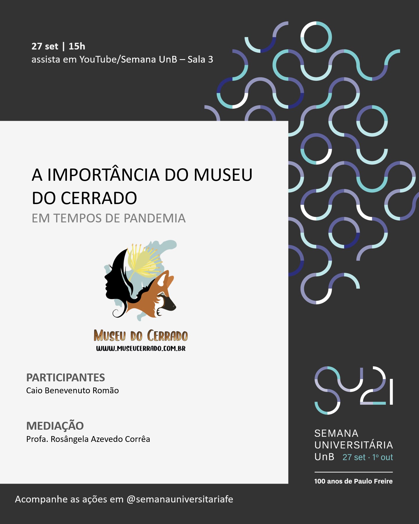 Museu do Cerrado na Semana Universitária 2021 da UnB Participe da Palestra “A importância do Museu do Cerrado em tempos de pandemia” que acontecerá na Semana Universitária 2021 da UnB, no dia 27 de setembro às 15h. Para receber certificação, busque pelo título da palestra e se inscreva em: https://sig.unb.br/sigaa/public/extensao/loginCursosEventosExtensao.jsf