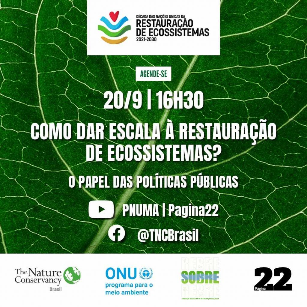 O objetivo de desenvolver um diálogo entre governos, empresas e sociedade civil em torno da restauração, dá origem ao webinar “Como dar escala à restauração de ecossistemas – o papel das políticas públicas” que será realizado no dia 20 de setembro, às 16h30, pela TNC, Programa das Nações Unidas para o Meio Ambiente (PNUMA) e Sociedade Brasileira de Restauração Ecológica (SOBRE), em parceria com a Página22.