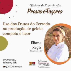 “Prosas e Fazeres” faz parte da programação de oficinas formativas que compõem o IV Festival Gastronômico de Arraias, que acontecerá nos dias 20, 21 e 22 de novembro, online, e será transmitido pelo Canal Gosto Cerrado, no YouTube.